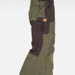 Calça impermeável com dois bolsos de abertura redonda nos costados, um bolso cargo lateral com fole central e lapela de presilha oculta. Dois bolsos traseiros interiores com fecho de correr. Pregas nas joelheiras. Elástico nos laterais da cintura e abranges nas costuras interior. Passadores. Fecho de presilha metálico e braguilha de fecho de correr. Revestido.