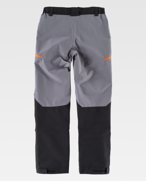 Calça impermeável combinada. Dois bolsos de abertura inclinada nos costados e dois bolsos laterais, todos interiores com fecho de correr com fecho inverso. Pregas nas joelheiras. Baixos ajustáveis com velcro. Elástico nos laterais da cintura e abrange nas costuras interiores. Passadores. Fecho de presilha metálico e braguilha de fecho de correr. Revestido.