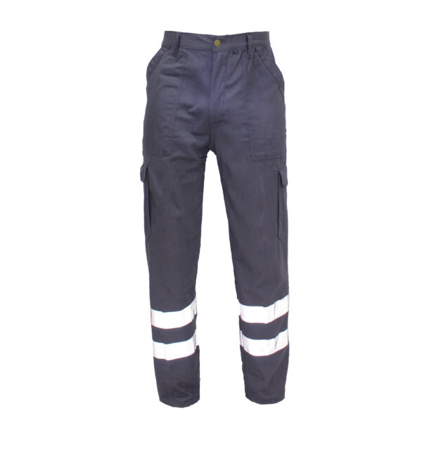 Calça 100% Algodão;Sarja de 240 g.;Costuras duplas e reforçada;Fecho zipper e botão;Cintura com elástico de ajuste;4 bolsos frontais e 2 traseiros;2 bandas refletoras em cada perna.