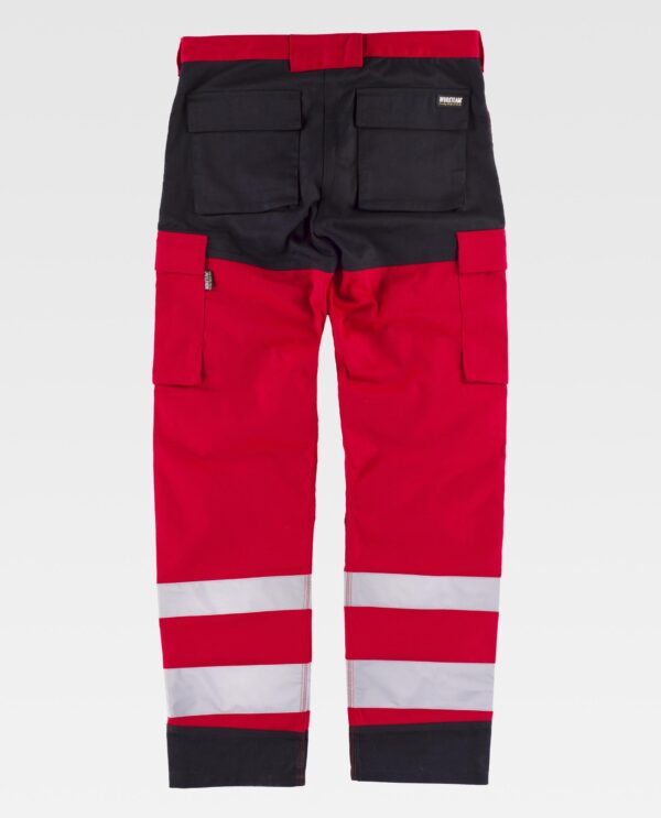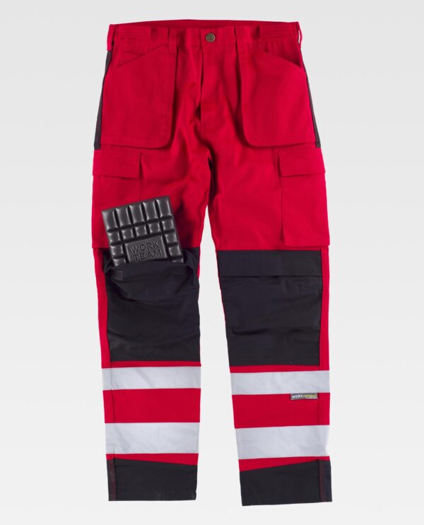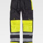 Calça combinada de tripla costura e fitas refletoras. Dois bolsos de fole com abertura inclinada nos costados, um bolso relojoeiro, dois bolsos cargo laterais com lapela de velcro. Dois bolsos traseiros com fole inferior e lapela de velcro. Reforços com fecho de velcro para joelheiras de protecção. Duas fitas refletoras de diferente tamanho nas perneiras. Cintura com ajustes laterais de velcro. Passadores. Argola metálica. Fecho de botão metálico e braguilha de fecho de correr.