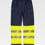 Calças antiestáticas e resistentes a produtos químicos, de alta visibilidade com fitas reflectoras. Dois bolsos laterais com abertura inclinada e um bolso traseiro, todos com casa de botão, lapela de seguridad e presilha oculta. Dois bolsos laterais de abertura vertical com fecho de correr vertical oculto. Duas fitas reflectoras nas pernas e combinadas com tecido de alta visibilidade. Cintura elástica. Passadores. Fecho de presilha oculta e braguilha com fecho de correr metálico.