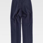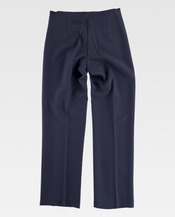 Calça clássica de senhora. Bolso relojoeiro. Vincos nas costas. Fecho de botão e braguilha de fecho de correr. A sua composição em 100% poliéster garante a estabilidade dimensional do vestuário.