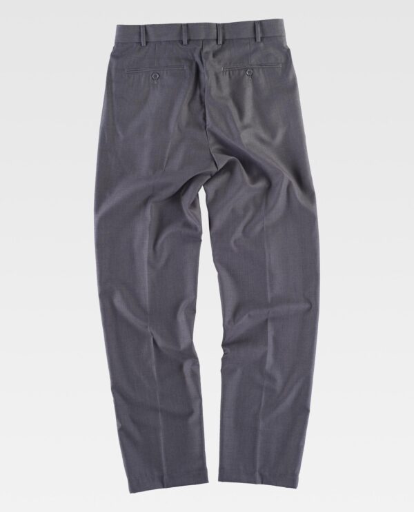 Calça clássica de senhor com pregas. Dois bolsos de abertura inclinada nos costados. Dois bolsos traseiros interiores com fecho de botão e casa de botão. Passadores. Fecho de botões duplos de plástico e gancho metálico, e braguilha com fecho de correr.
