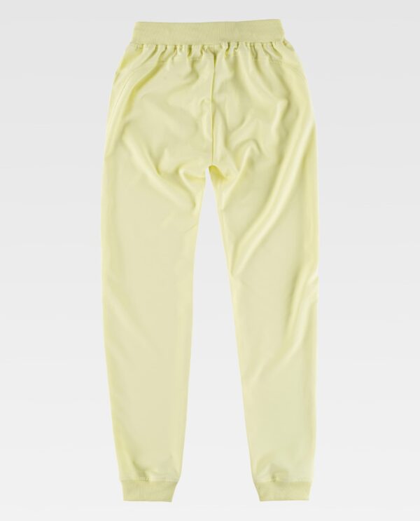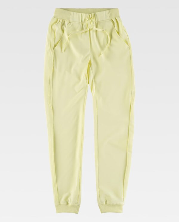 Calça com tecido elástico. Dois bolsos de abertura inclinada nos laterais. Elástico na cintura e ajustável com cordão. Bainha com elástico.