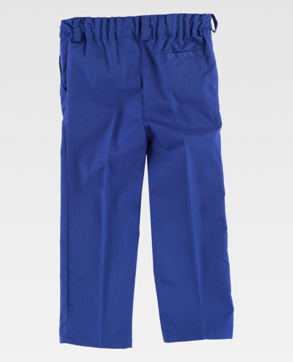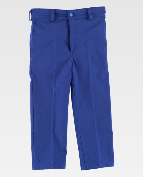 Calça criança recta com dois bolsos de abertura inclinada nos costados. Um bolso traseiro semi-embutido. Elástico na cintura. Passadores. Fecho de botão e braguilha de fecho de correr.