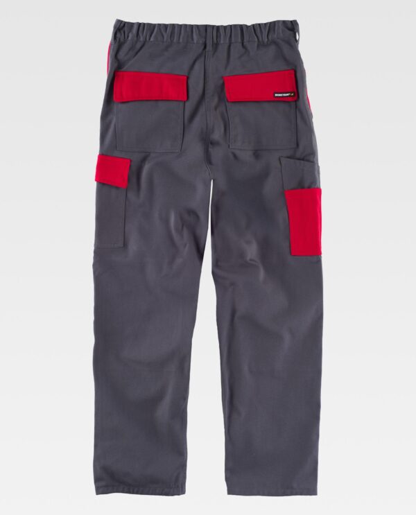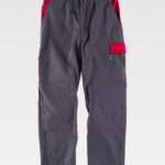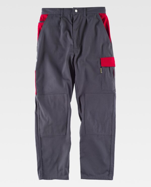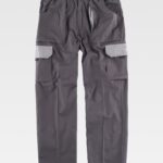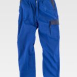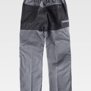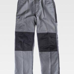 Calça combinada com reforços. Dois bolsos de abertura inclinada nos costados, um bolso relojoeiro e um bolso cargo lateral com fole central e lapela de velcro. Dois bolsos traseiros de chapa com lapela de velcro e um bolso de espátula dupla. Joelheiras reforçadas picotadas. Detalhes e lapela em contraste. Elástico na cintura. Passadores. Fecho de botão metálico e braguilha de fecho de correr d metal.