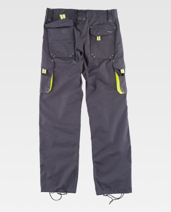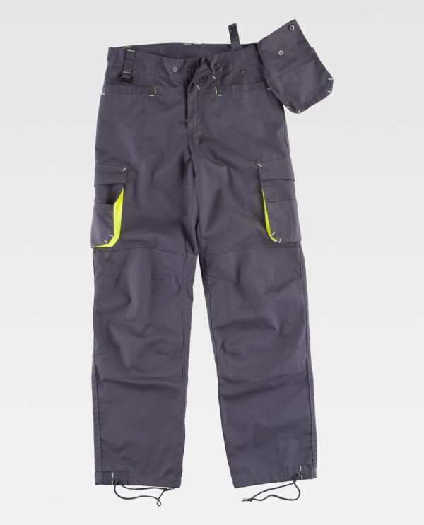 Calça combinada com reforços, detalhes fluorescentes-refletores e presilhas em contraste. Dois bolsos de abertura inclinada nos costados e um bolso desmontável para ferramentas. Dois bolsos cargo laterais com bolsos auxiliares sobrepostos e dois bolsos de chapa traseiros, todos com lapela de velcro e ganchos. Joelheiras reforçadas. Baixos ajustáveis com cordão. Sem elástico na cintura. Passadores. Argola, fecho de dupla presilha e braguilha de fecho de correr.