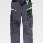 Calça tripla cor com tecido canvas. Dois bolsos abertura inclinada nos laterais. Um bolso lateral de espátula, outro de carga con fecho de velcro e outro sobrepor para canetas. Dois bolsos traseiros com fecho de velcro. Tira porta martelo. Reforço com fecho de velcro para joelheiras de protecção. Vivos refletores e presilhas em contraste. Elástico nos laterais da cintura. Presilhas. Fecho de botão metálico e braguilha com cremalheira.