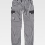 Calça tripla cor com tecido canvas. Dois bolsos abertura inclinada nos laterais. Um bolso lateral de espátula, outro de carga con fecho de velcro e outro sobrepor para canetas. Dois bolsos traseiros com fecho de velcro. Tira porta martelo. Reforço com fecho de velcro para joelheiras de protecção. Vivos refletores e presilhas em contraste. Elástico nos laterais da cintura. Presilhas. Fecho de botão metálico e braguilha com cremalheira.
