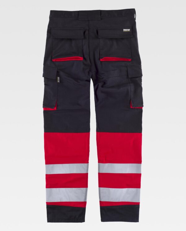 Calça combinada de costura tripla com fitas refletoras. Dois bolsos de fole com abertura inclinada nos costados, um bolso relojoeiro, dois bolsos cargo laterais com lapela de velcro. Dois bolsos traseiros com fole inferior e lapela de velcro. Reforço com fecho de velcro para joelheiras de protecção. Duas fitas refletoras de diferente tamanho nas perneiras. Cintura com ajustes laterais de velcro. Passadores. Argola metálica. Fecho de botão metálico e braguilha de fecho de correr.
