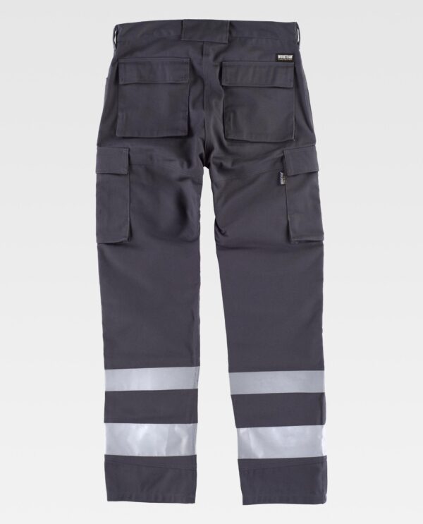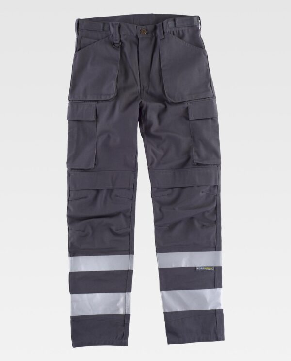Calça de costura tripla com fitas refletoras. Dois bolsos de fole com abertura inclinada nos costados, um bolso relojoeiro, dois bolsos cargo laterais com fole inferior e lapela de velcro. Dois bolsos traseiros com fole inferior e lapela de velcro. Reforço com lapela de velcro para joelheiras de protecção. Duas fitas refletoras de diferentes tamanhos nas perneiras. Cintura com ajustes laterais de velcro. Passadores. Argola. Fecho de botão metálico e braguilha de fecho de correr.