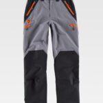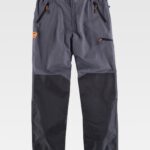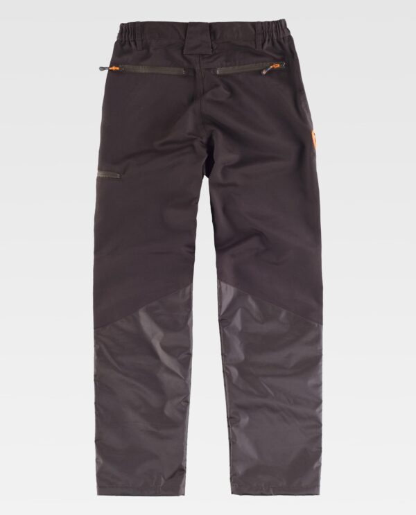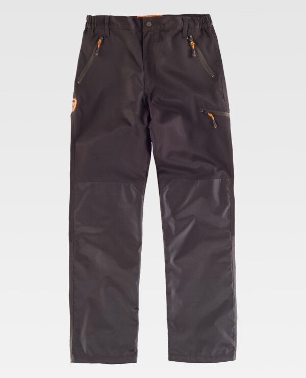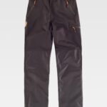 Calça recta com dois bolsos inclinados nos laterais, outro lateral e dois traseiros, todos inseridos com cremalheira de fecho inverso. Reforço nos joelhos com tecidos combinados. Elástico nos laterais da cintura. Presilhas de diferentes tamanhos. Fecho de mola metálica e braguilha de cremalheira metálica.