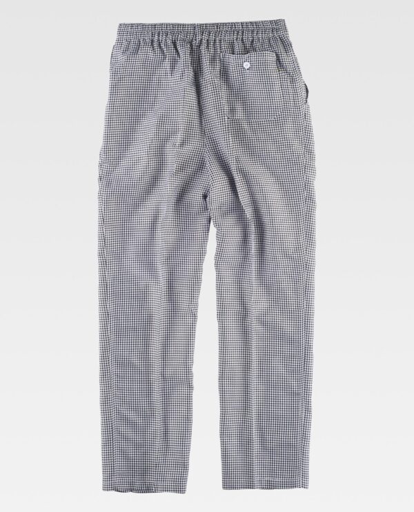 Calça unissex em tecido de pata de galo. Dois bolsos de abertura inclinada nos costados. Um bolso de chapa traseiro com fecho de botão e casa de botão. Elástico na cintura. Passadores. Fecho de botão e braguilha de fecho de correr.