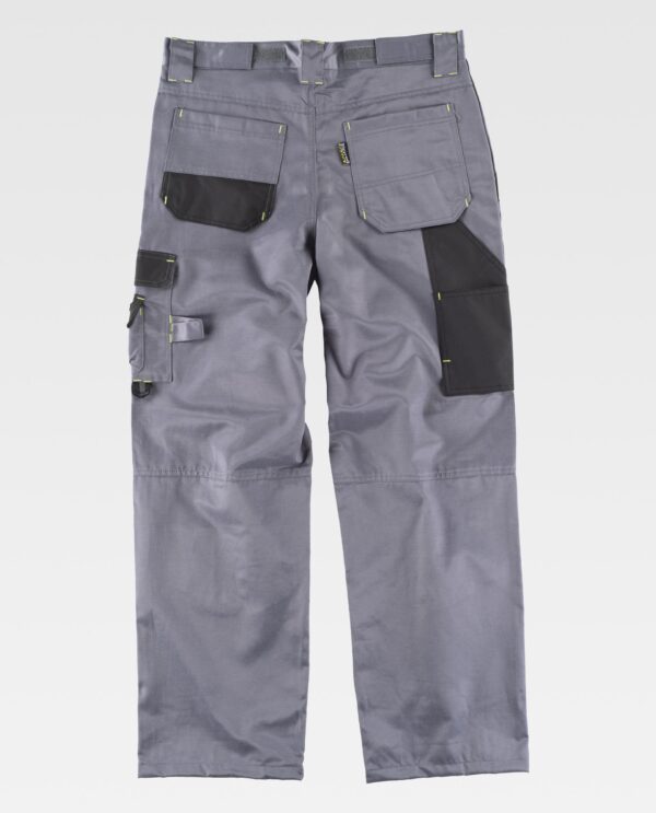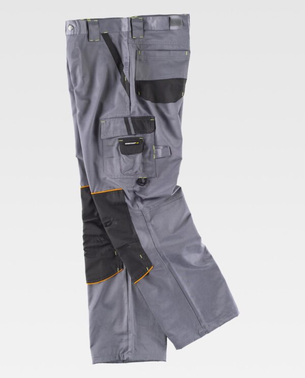 Calça combinada com reforços costura tripla em tecido Beaver Nylon de alta resistência, anti-nódoas e repelente aos líquidos. Dois bolsos de abertura inclinada nos costados. Um bolso cargo lateral com argola e bolso auxiliar sobreposto, ambos com lapelas de velcro. Dois bolsos traseiros com prega no baixo e fecho de velcro e um bolso de espátula dupla. Passador porta martelo. Reforços com debruns em contraste e fecho de velcro para joelheiras de protecção. Ajuste de velcro nos laterais da cintura. Passadores grossos. Fecho de botão metálico e braguilha de fecho de correr.