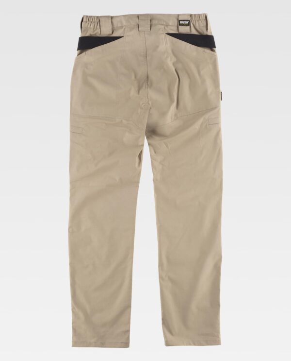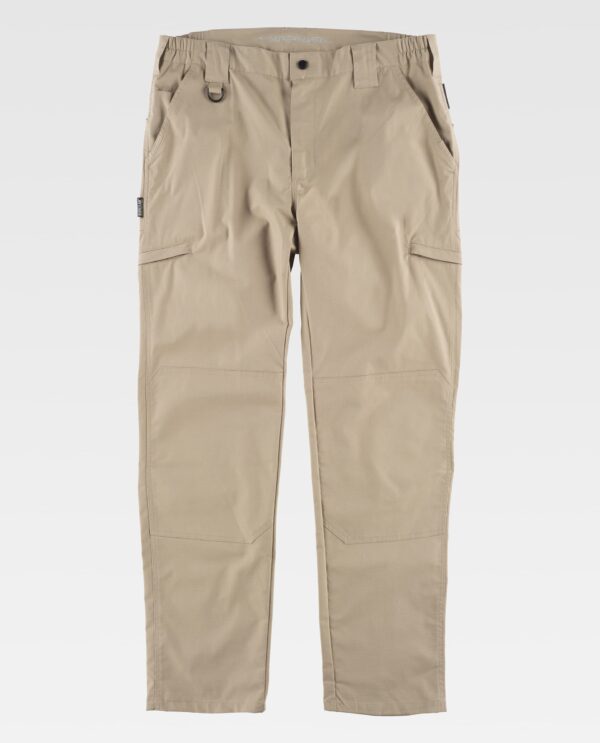 Calça em tecido Ripstop com reforços, desenho “Slim Fit”. Dois bolsos de abertura inclinada nos costados com bolso relojoeiro, dois bolsos laterais interiores com fecho de cremalheira metálica. Dois bolsos no reforço do assento com fecho de velcro. Fita de tecido preto para pendurar. Joelheiras e assento reforçados. Elástico nos laterais da cintura. Passadores grossos. Argola de plástico. Fecho de mola automática e braguilha com cremalheira metálica.