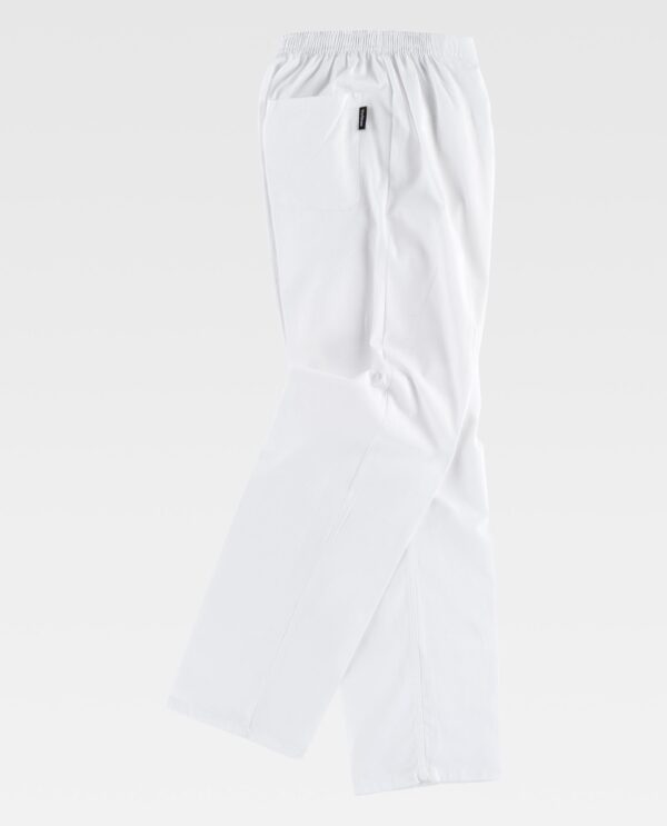 Calça sanitária unissex em algodão. Um bolso de chapa traseiro. Elástico na cintura. Fecho de botão e braguilha de fecho de correr. Ligeiro, hipoalergénica e de toque suave.
