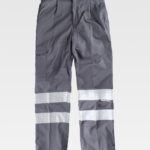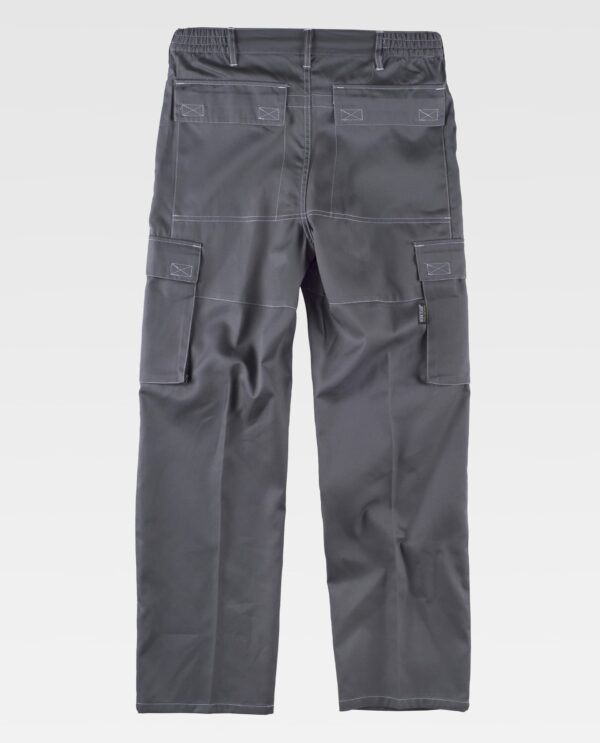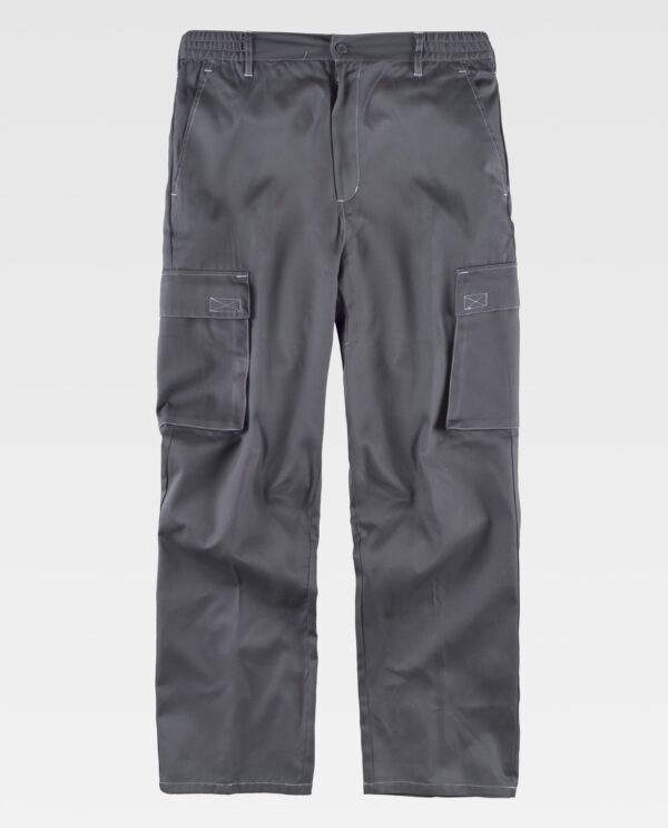 Calça com costura contrastante. Dois bolsos de abertura inclinada nos costados, dois bolsos de carga laterais com lapela de velcro. Dois bolsos no reforço do assento com lapela de velcro. Elástico nos laterais da cintura. Passadores. Fecho de botão e braguilha de fecho de correr.