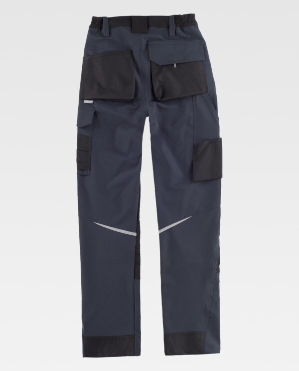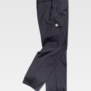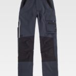 Calça combinada com elástico. Dois bolsos com abertura inclinada nos lados. Um bolso para espátula com dois compartimentos, um com prega inferior e lapela de velcro, e um auxiliar sobreposto e compartimentado com lapela de velcro nas pernas. Dois bolsos traseiros de fole, um com lapela de velcro. Cortes decorativos e pregas nos joelhos. Detalhes reflectores. Elásticos laterais na cintura. Presilhas. Fecho com botões metálicos e braguilha com fecho de correr.