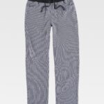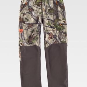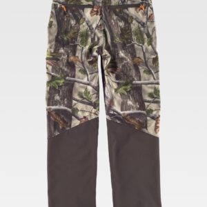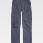 Calça combinada com elástico. Dois bolsos com abertura inclinada nos lados. Um bolso para espátula com dois compartimentos, um com prega inferior e lapela de velcro, e um auxiliar sobreposto e compartimentado com lapela de velcro nas pernas. Dois bolsos traseiros de fole, um com lapela de velcro. Cortes decorativos e pregas nos joelhos. Detalhes reflectores. Elásticos laterais na cintura. Presilhas. Fecho com botões metálicos e braguilha com fecho de correr.