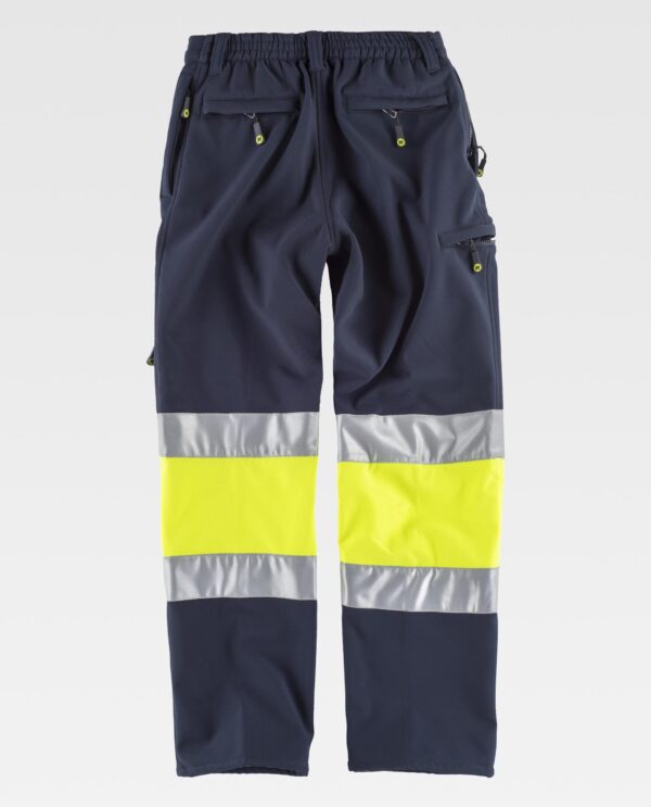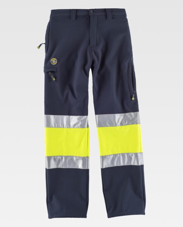 Calça Workshell combinada de alta visibilidade e fitas refletoras. Dois bolsos de abertura vertical nos costados e dois bolsos laterais, todos interiores com fecho de correr. Dois bolsos traseiros interiores com fecho de correr. Duas fitas refletoras nas perneiras com franja de alta visibilidade. Elástico na cintura. Passadores. Fecho de botão e braguilha de fecho de correr. Tecido corta-ventos, repelente à água e resistente ao rasgo com membrana interior respirável e isolante no interior de alta capacidade térmica.