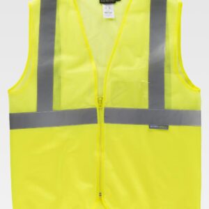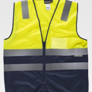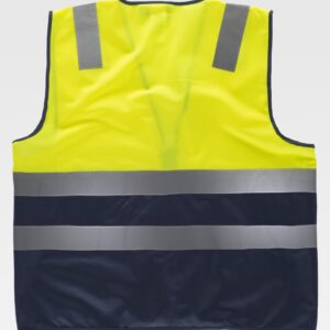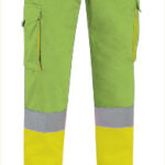 Calças de Alta Visibilidade multibolsos bicolor. Confecionadas em tecido de sarja de algodão com poliéster para durabilidade e resistência, inclui duas fitas retro-refletoras cosidas nos punhos das pernas para maior segurança. Vestuário certificado como EPI Categoria II de Alta Visibilidade de acordo com as normas 13688 e 20471, classe 1, duração máxima de 50 lavagens. Fecho de correr com botão e pala, cintura com elástico na parte traseira para melhor ajuste, costuras duplas principais e pontos de maior tracção reforçados com presilhas de segurança para maior durabilidade e resistência. Dois bolsos inclinados na cintura, dois laterais com fole e dois traseiros (todos os quatro com pala, velcro e puxador refletor bicolor para fácil abertura) para ter tudo acessível e disponível. Métodos adequados de marcação: serigrafia, transfer, vinil, bordados, cosidos. Ideal como roupa de trabalho e uniformes profissionais.