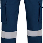 Calças de trabalho multibolsos com Visibilidade Aumentada. Confecionadas em tecido sarja de algodão com poliéster para maior durabilidade e resistência, com duas fitas retro-refletoras cosidas nos punhos das pernas para maior segurança. Vestuário certificado como EPI de Categoria II de Visibilidade Aumentada de acordo com as normas 13688 e 17353, tipo B2 para visibilidade nocturna, duração máxima de 25 lavagens. Dois bolsos inclinados na zona da cintura, dois laterais com fole e dois traseiros (quatro com pala, velcro e puxador refletor bicolor para fácil acesso). Costuras principais duplas e pontos de maior tracção reforçados com presilhas de segurança para durabilidade e resistência. Métodos adequados de marcação: serigrafia, transfer, vinil, bordados, cosidos. Ideal como roupa de trabalho e uniformes profissionais.