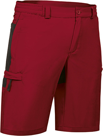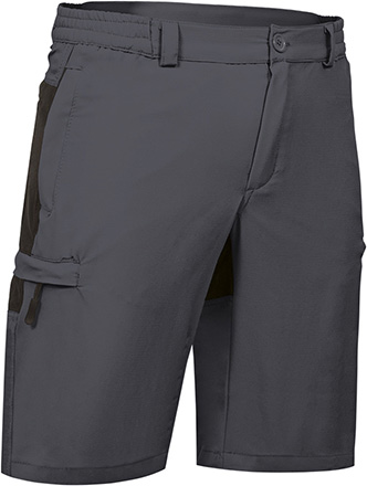 Bermuda multibolsos bicolor. Confecionada em tecido bi-elástico leve Rip-Stop com acabamento repelente à água e secagem rápida, muito confortável e fresco. Parte traseira em cor contrastante (exceto azul marinho). Cintura elástica nos lados para melhor ajuste e maior conforto. Seis bolsos: dois verticais na cintura, dois laterais e dois traseiros, todos com fecho de correr e vivo, para fácil acesso. Métodos adequados de marcação: serigrafia, transfer, vinil, bordados, cosidos. Ideal como roupa de trabalho, uniformes de verão e como bermuda para trekking e actividades ao ar livre.