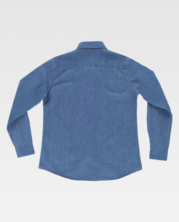 Camisa entalhada de senhora em tecido ganga de gola clássica e fecho central de botões. Manga comprida com punho de botão. Um bolso de chapa no peito com fecho de botão e casa de botão. Corpete nas costas. Costuras reforçadas nos costados, cavas, ombros e mangas. Baixo redondo e botões de madeira.