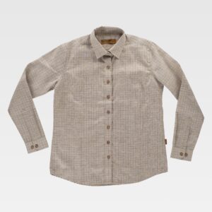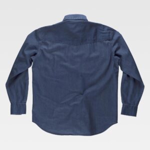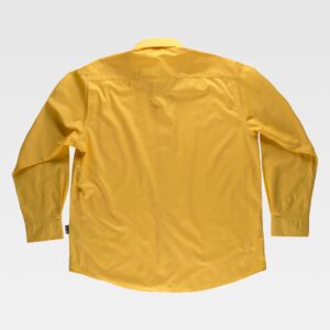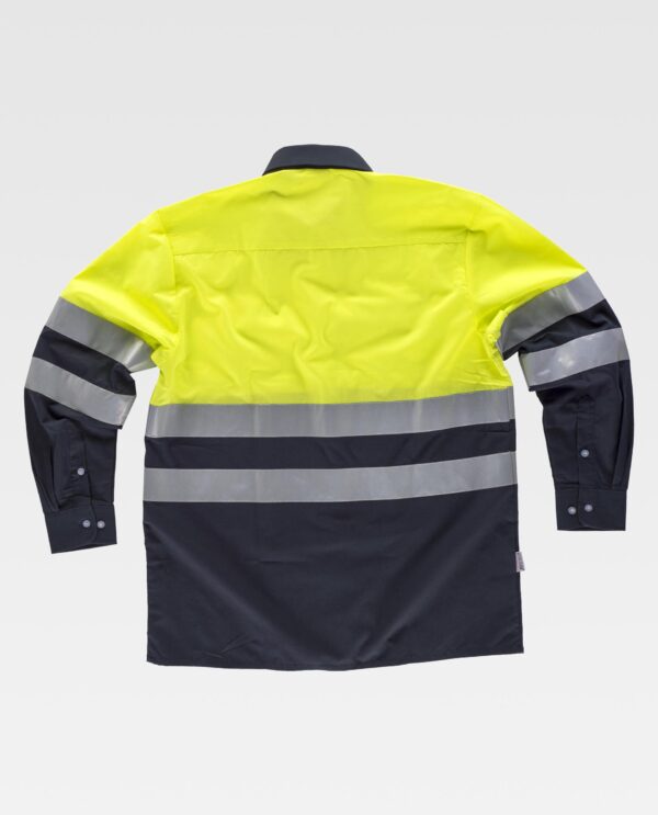 Camisa combinada de manga comprida com fitas refletoras. Parte superior de alta visibilidade. Gola clássica e fecho central de botões. Dois bolsos de chapa no peito com lapela de botão. Duas fitas refletoras no peito, nas costas e nas mangas. Punho de botão. Corpete nas costas.