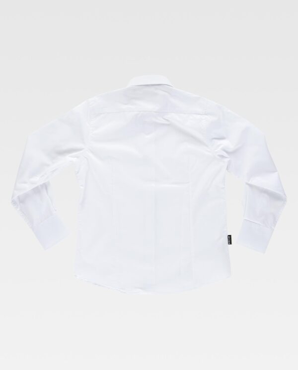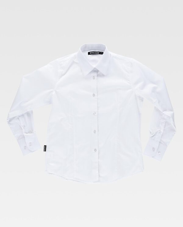 Camisa entalhada de senhora com gola clássica e fecho central de botões. Manga comprida com punho de botão. Corpete nas costas. Costuras reforçadas, baixo arredondado e botões no mesmo tom.