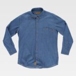 Camisa em tecido ganga de gola clássica e fecho central de botões. Manga comprida com punho de botão. Um bolso de chapa no peito com fecho de botão e casa de botão. Corpete nas costas. Costuras reforçadas nos costados, cavas, ombros e mangas. Baixo redondo e botões de madeira.