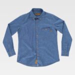 Camisa em tecido ganga de gola clássica e fecho central de botões. Manga comprida com punho de botão. Um bolso de chapa no peito com fecho de botão e casa de botão. Corpete nas costas. Costuras reforçadas nos costados, cavas, ombros e mangas. Baixo redondo e botões de madeira.