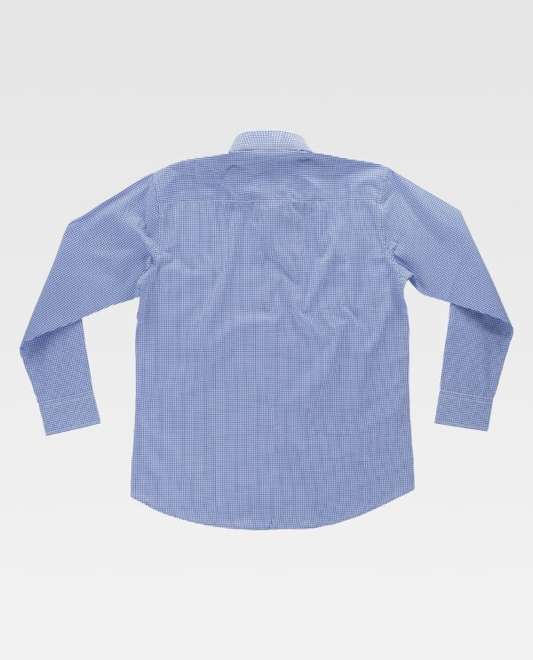 Camisa em tecido de quadrados com gola clássica e fecho central de botões. Manga comprida com punho de botão. Um bolso de chapa aberto no peito. Costas com corpete. Costuras reforçadas, baixo redondo e botões.