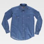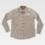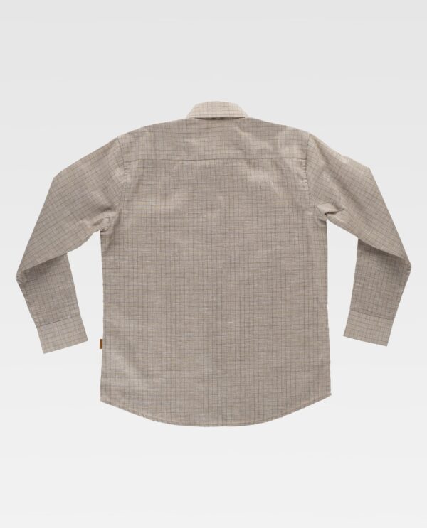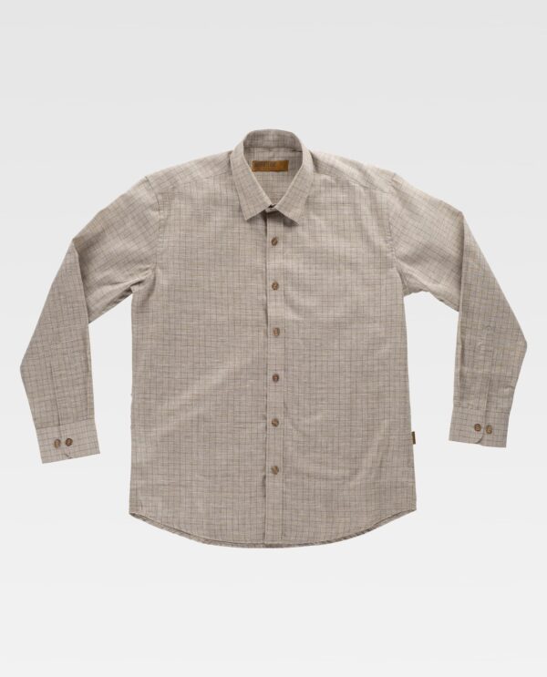 Camisa em tecido de quadrados de gola clássica e fecho central de botões. Manga comprida com punho de botão. Corpete nas costas. Costuras reforçadas. Baixo redondo e botões de madeira.