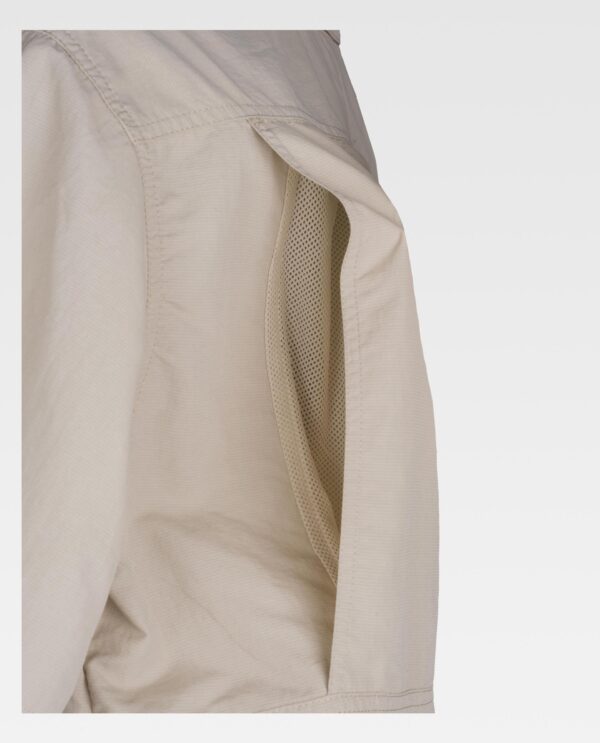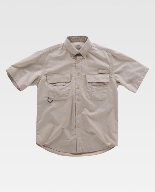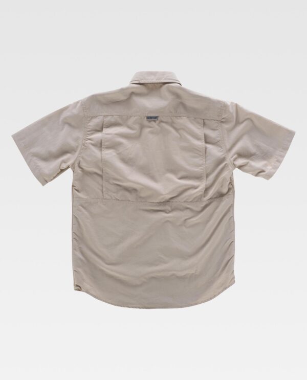 Camisa safari de manga curta com abertura traseira e rede interior para regular a transpiração. Gola abotoado e fecho central de botões. Dois bolsos de chapa no peito com lapela de velcro e bolsos auxiliares sobreposto. Argola de cordão elástica no bolso. Cincha com velcro no peito. Costas com corpete. Costuras reforçadas, baixo arredondado e botões no mesmo tom. Tecido resistente e de secagem rápida.