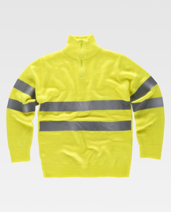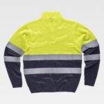 Camisola de alta visibilidade em ponto grosso com fitas refletoras. Gola alta com fecho de meio fecho de correr. Gola, punhos e cintura em ponto de canelado. Duas fitas refletonas no peito, nas costas e nas mangas.