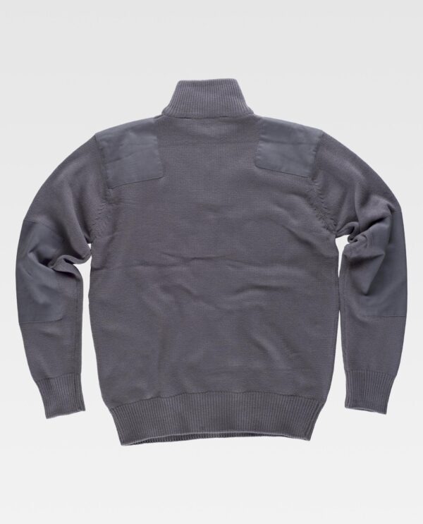 Camisola de algodão com gola alta em ponto grosso. Fecho de meio fecho de correr de náilon. Reforços de sarja de igual tonalidade nos ombros e cotovelos. Gola, punhos e cintura elásticos em ponto de canelado. Corte desportivo.
