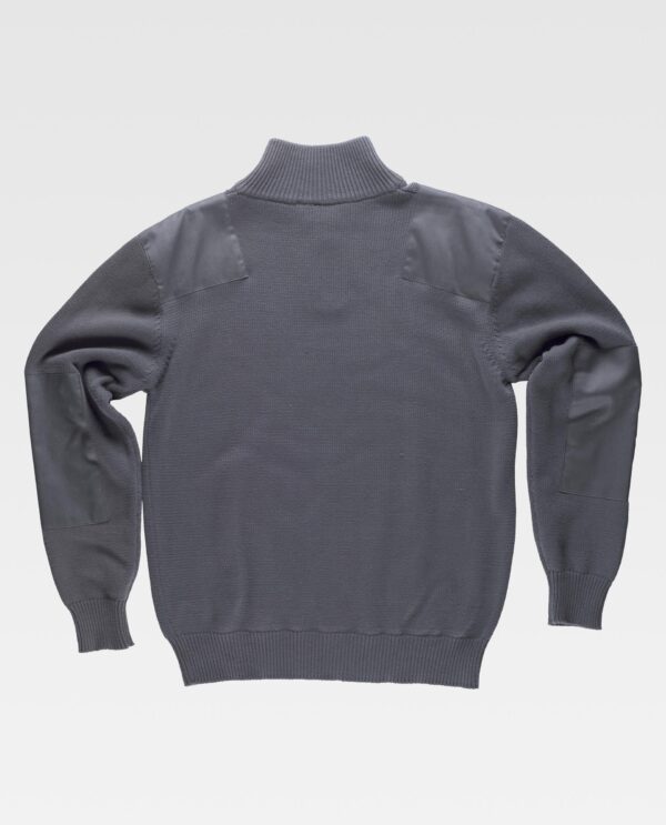Camisola de gola alta em ponto grosso. Fecho de meio fecho de correr de náilon. Reforçado de sarja de igual tonalidade nos ombros e cotovelos. Gola, punhos e cintura elásticos em ponto de canelado. Corte desportivo.