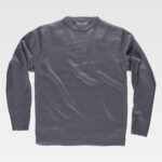 Camisola de gola redonda em ponto grosso. Reforços de sarja de igual tonalidade em ombros e cotovelos. Gola, puños e cintura elásticos em ponto de canelado.