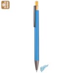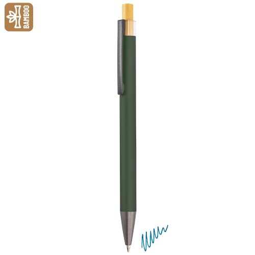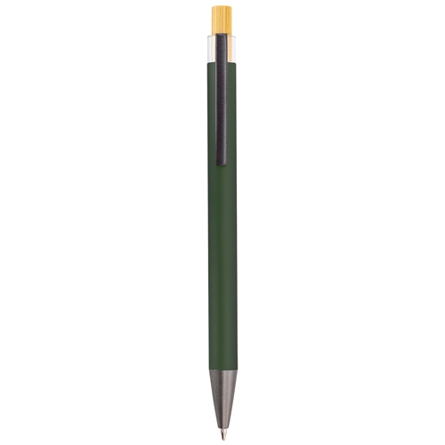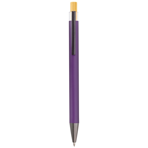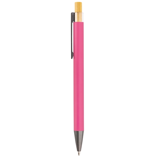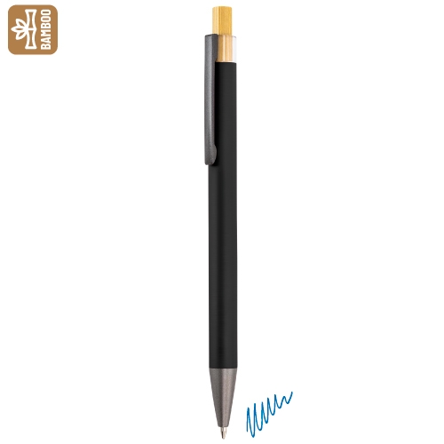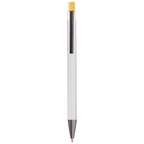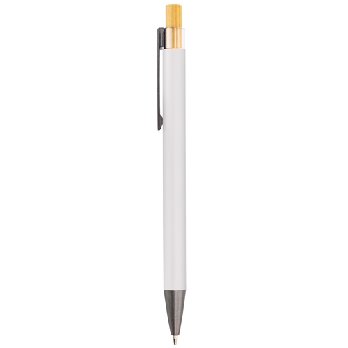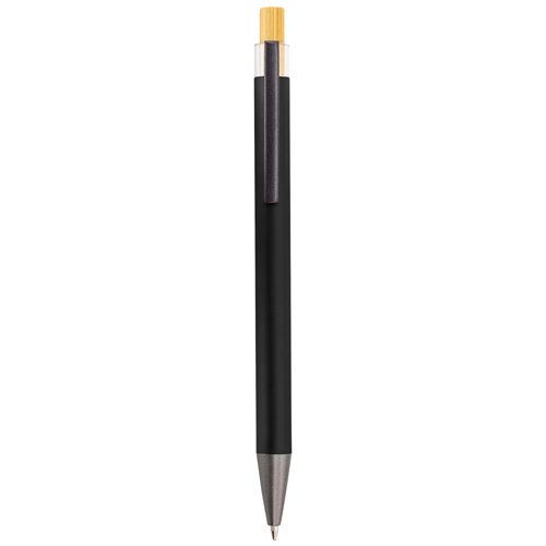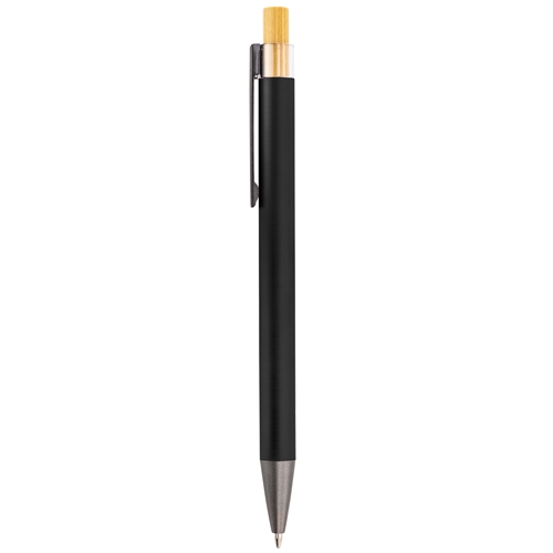 Caneta esferográfica com corpo em alumínio com acabamento mate e botão de pressão em bambu natural. Combina estilo moderno e materiais ecológicos, perfeita para se destacar com um detalhe útil e sustentável.