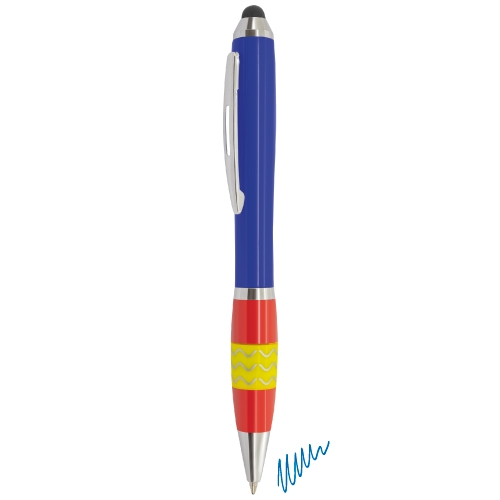 Caneta anti-stress giratória com detalhes das bandeiras espanhola, francesa e italiana. Escrita azul