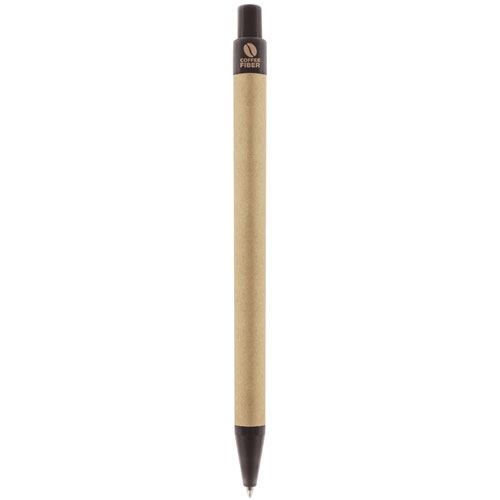 Caneta realizada em cartão reciclado e fibra de café, um material degradável e ressistente, realizado a partir da borra de café, dando como resultado um producto mais sustentável.Escritura azul