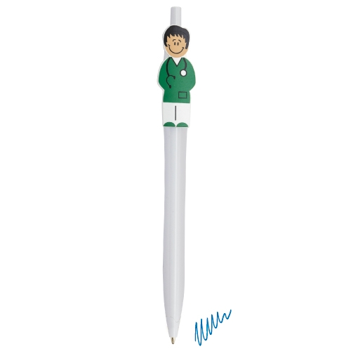 Canetas com desenhos de professionais, como doutora (ref. 10585), doutor (ref. 10586), enfermeiro (ref. 10587), enfermeira (ref. 10588), farmacéutica (ref. 10589), farmacéutico (ref. 10590), policía (ref. 10591) e guardia civil (ref. 10592),Escritura azul.