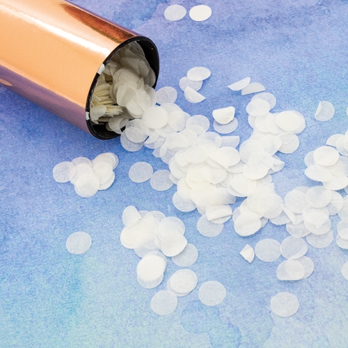Canhão confeti com mola.Confeti de forma redonda cor brancaSe enviam embolsados em múltiplos de 10 unids (quantidade mínima)