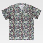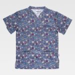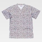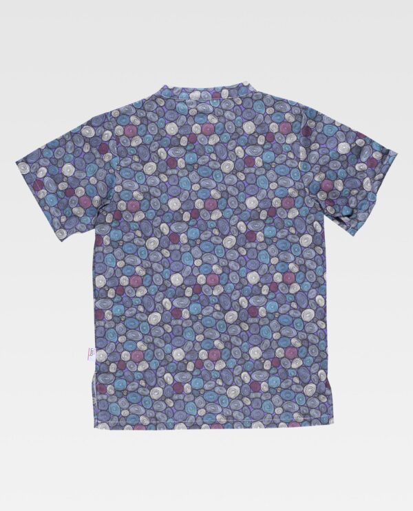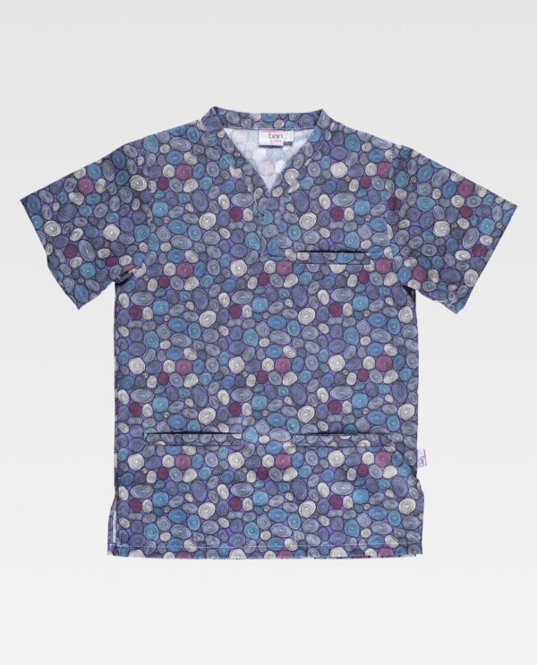 Casaca unissex de manga curta com impresso de círculos concêntricos e acabado anti-nódoas. Colarinho cruzado, um bolso no peito e dois semi-embutidos laterais. Aberturas nos costados.