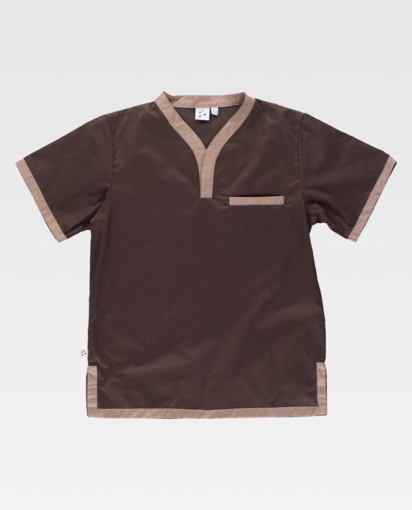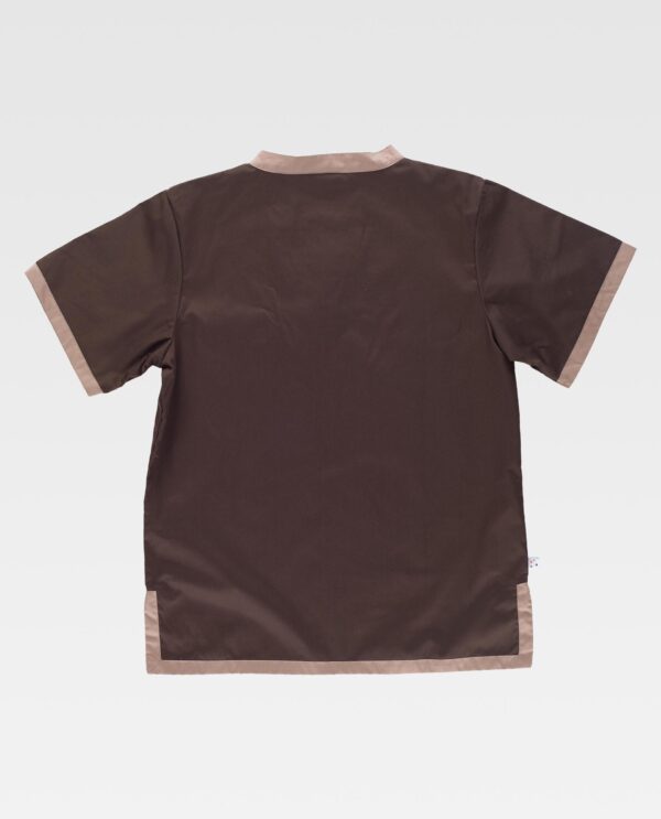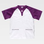Casaca combinada de manga curta com colarinho cruzado. Um bolso semi-embutido no peito. Gola, bolso, mangas e baixo com detalhes em contraste. Aberturas laterais.