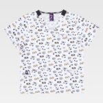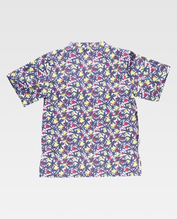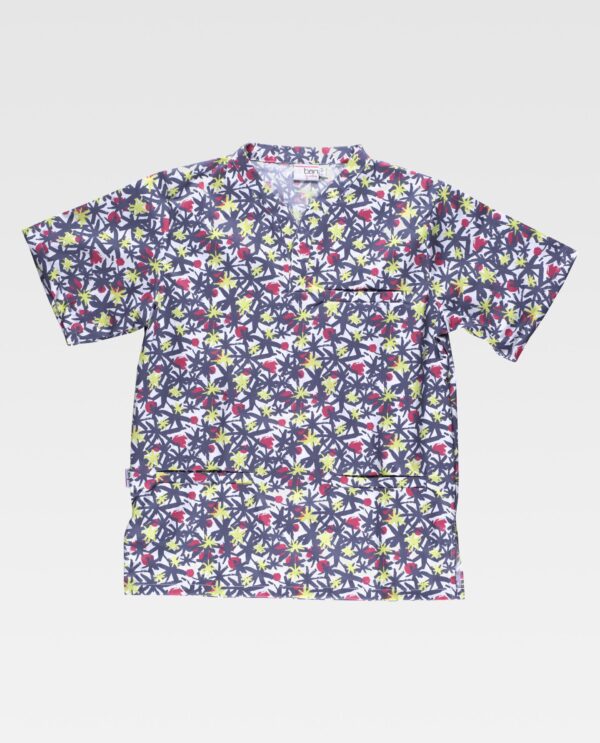 Casaca unissex de manga curta com impresso multicolor e acabado anti-nódoas. Colarinho cruzado, um bolso no peito e dois semi-embutidos laterais. Aberturas nos costados.