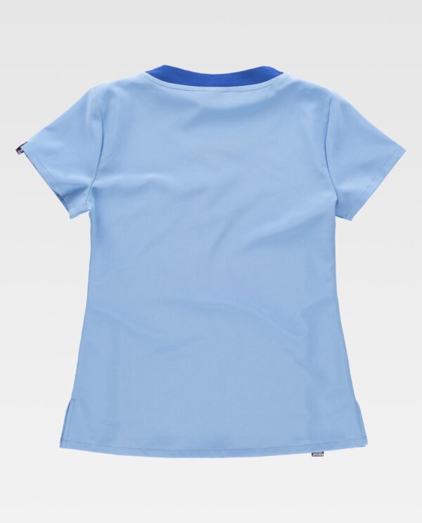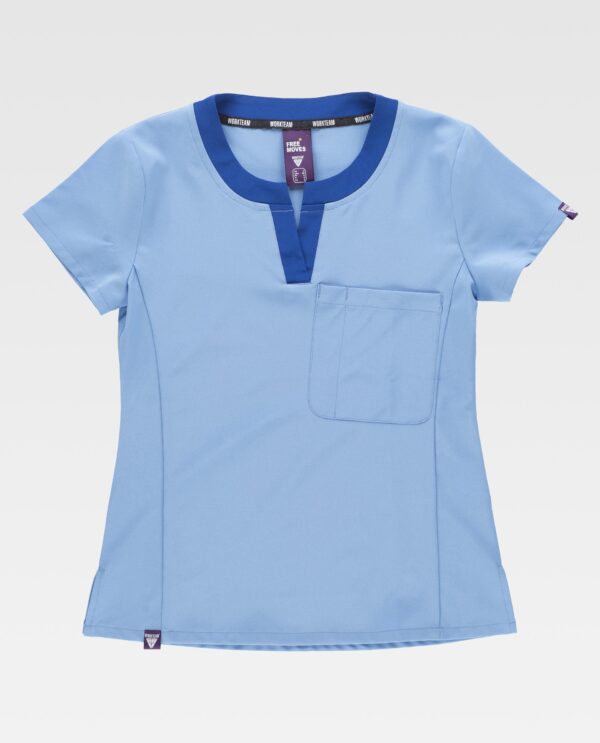 Túnica entalhada de senhora combinada, manga curta com tecido elástico. Gola redonda combinada com abertura a bico. Um bolso de chapa no peito. Um bolso para canetas. Aberturas nos laterais.
