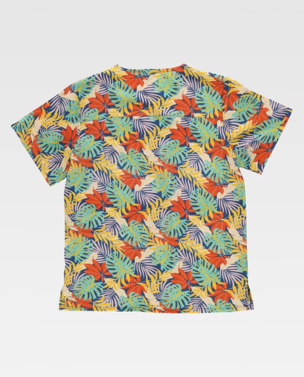 Túnica unissexo de manga curta com tecido elástico e estampada. Gola a bico com biés e elásticos combinados. Debrum nas costas. Um bolso no peito e dois laterais, aberturas nos laterais.