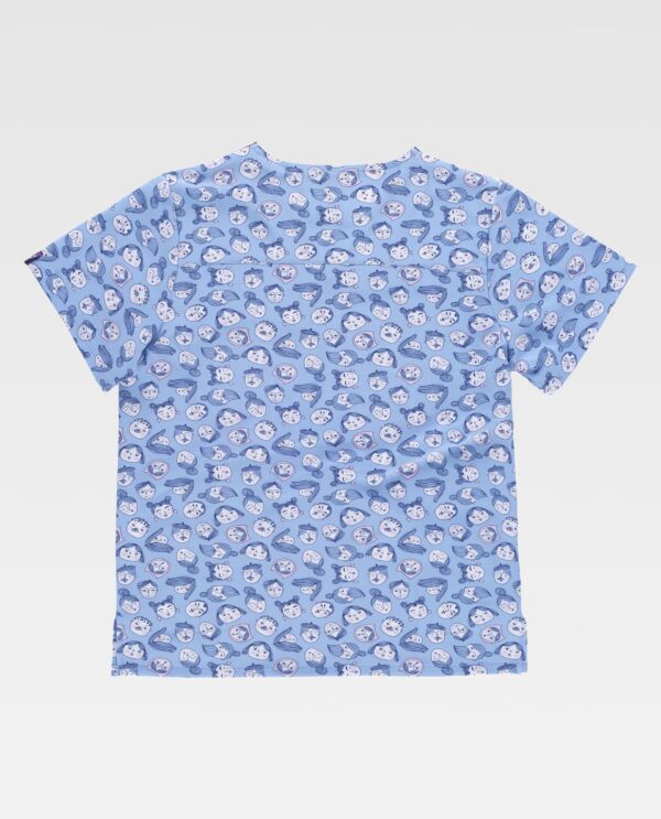 Túnica unissexo de manga curta com tecido elástico e estampada. Gola a bico com biés e elásticos combinados. Debrum nas costas. Um bolso no peito e dois laterais, aberturas nos laterais.